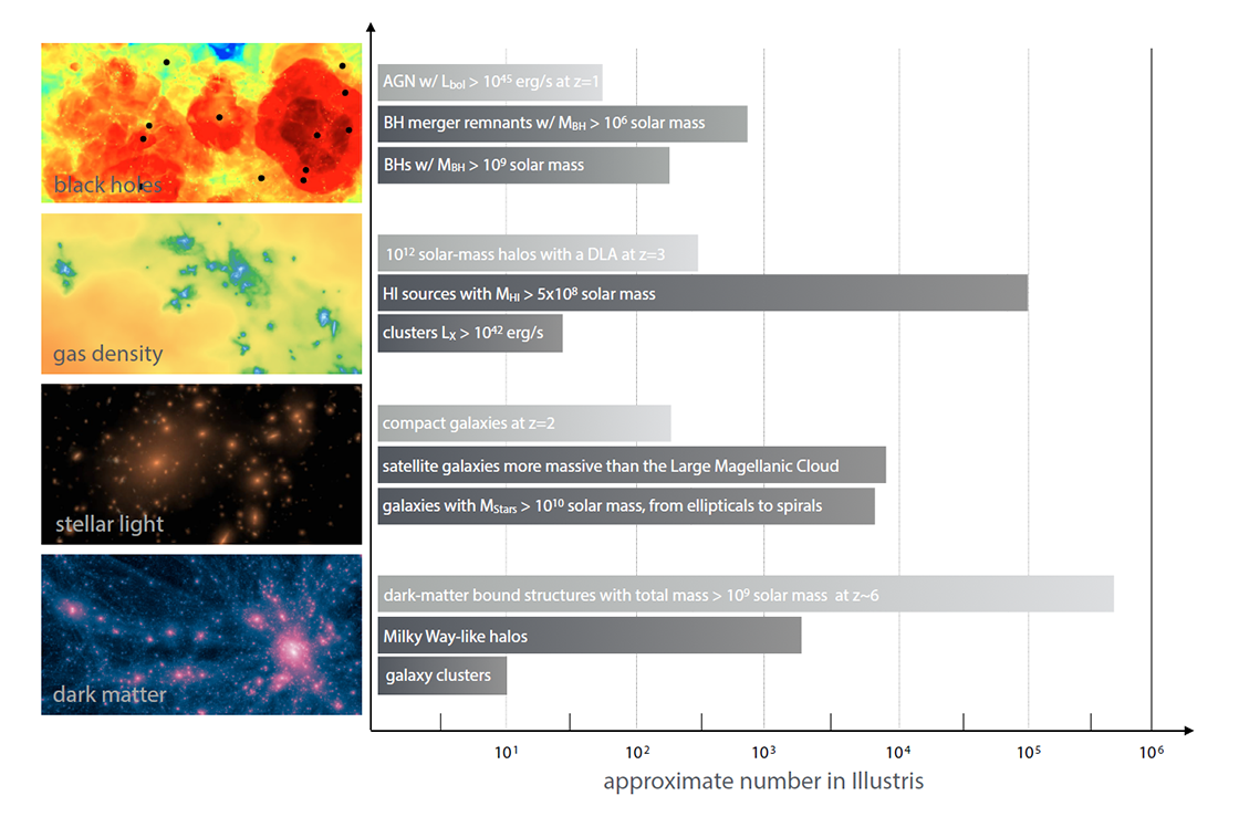 In the table above we provide an overview of the specifications of the six Illustris runs, including the computational volume, gravitational softening lengths, and masses of the different particle/cell types, which collectively indicate the resolution and dynamic range achieved. To emphasize the variety of galaxy formation and evolution phenomena which can be addressed with the Illustris simulations, in the following figure we give the approximate number of a selection of interesting astrophysical objects that can be found in the simulated box, from dark-matter dominated halos at $z=0$ to luminous active galactic nuclei (AGN) at higher redshifts.