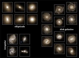 Stellar light distributions (g,r,i bands) for a sample of galaxies at z = 0 arranged along the classical Hubble sequence for morphological classification. Our simulation produces a variety of galaxy types ranging from ellipticals to disk galaxies to irregular systems, the latter mostly resulting from interactions and mergers.